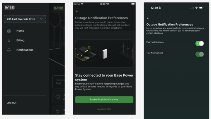 Base sends all power outage notifications exclusively via app push notifications. This includes real time notifications when the outage begins, if your battery is draining quickly due to high usage, and when the outage ends.