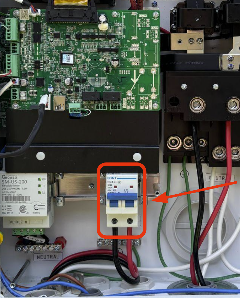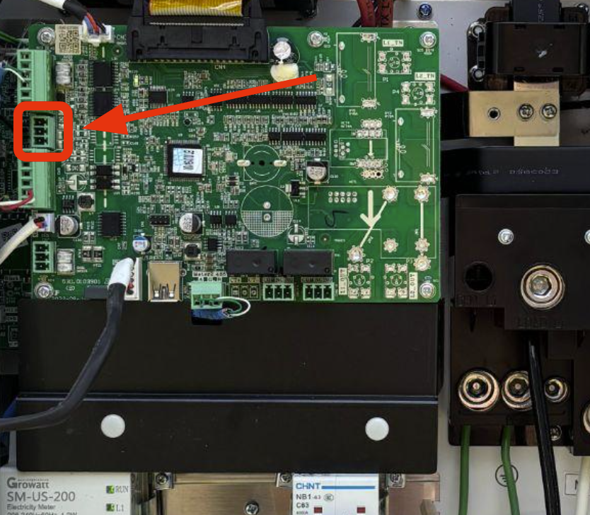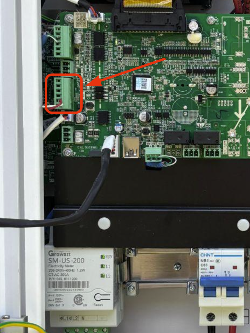 The Hub is the the white panel that contains our 200A service disconnect. Insert the bypass jumper into the Hub board.